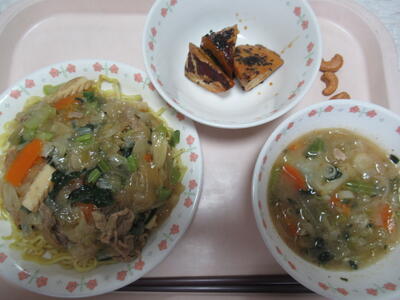 11月21日 焼きそばの五目あんかけ 味噌雲呑 大学芋 カシューナッツ