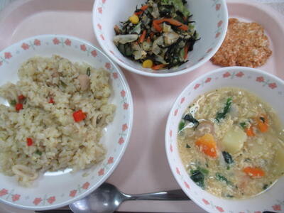 11月25日 パエリア ひじき入り鉄人サラダ ポテトとたまごのスープ オートミールビスケット
