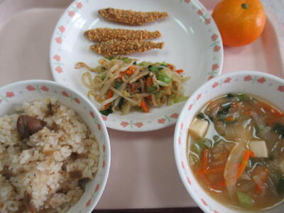 11月26日 鶏ゴボウご飯 おひたし 切り干し大根の味噌汁 きびなごフライ みかん