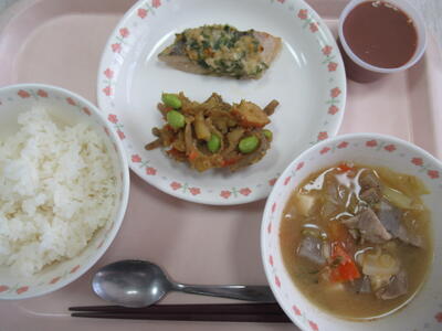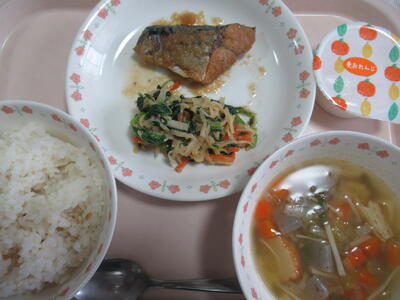 今日は魚料理の献立。サバのおろし煮は子供に食べやすく味付けられている。ごはんによく合う味でおいしい。切り干し大根の胡麻和えは、シャキシャキとして胡麻和えの味もしっかりとしている。たぬき汁はなぜたぬきになるのか、揚げが入っているのがたぬき汁のゆえんであろう。生姜がきいたお汁であるが、出汁が少し弱い感じがあり、もう少しパンチがきいた味付けでもよかったと感じる。
