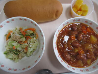 10月29日(火) はちみつパン チリコンカン キャベツとしめじのサラダ 桃缶