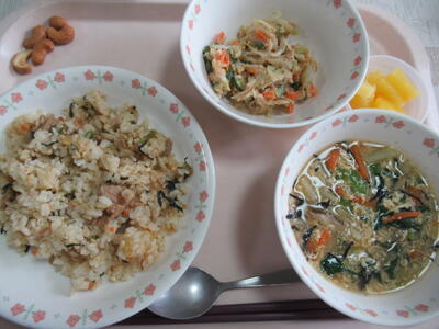 今日は中華風献立で、チャーハンにサラダと中華風スープの組み合わせである。棒々鶏風サラダは、ツナを棒々鶏に見立ててゴマ風味の特製タレで味付けたサラダで工夫が見られる。野菜の水が少し出てしまったために、味が薄まってしまったのが残念だが、味噌とごまを使った味の工夫は再挑戦で味わいたい。チャーハンも同じく味のパンチが少なく、塩は控えめでもニンニクやごま油の補強が欲しいところであった。中華風ひじきのスープには、ひじきとジャガイモがたくさん入り、ジャガイモのとろみに卵のとろみが加わるスープで美味しいが、もう少しごま油が効くと一層の旨味が増したかと感じる。パイン缶はパイナップルの美味しさを味わうデザートである