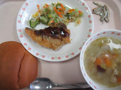 10月11日 給食ロール しいらのフライ コーンサラダ 豆とサツマイモのスープ