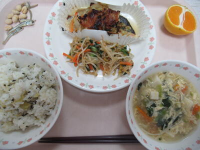 10月15日 さつまいもご飯 鮭のちゃんちゃん焼き もやしのポン酢和え かきたま汁 みかん 大豆小魚