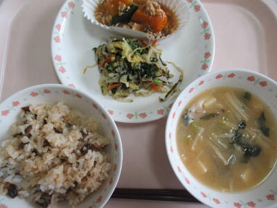 今日は和食献立で、いなだの照り焼きと豚汁とかんぴょうのゴマ和え。いなだの照焼きは、タレの味は美味しくご飯にもよく合う味付けで美味しい。下味つけに十分な時間がとれると身にも味が染みこんで、パサつき感もしっとりとするのではと感じる。冷凍を解凍しながらの下味処理に一工夫ができるとよい。さわらは、ぶりに出世する出世魚である紹介が放送でされ、子どもたちに日本の食文化として伝えたいことである。かんぴょうは、夏が季節。夕顔の実からかんぴょうを作るが栃木県の産物で、修学旅行の食事にも出ていた。ゴマ酢和えは、ゴマの香りと酢の感じがちょうどよい味付けであるが、かんぴょうの刻み方が小さく、かんぴょうの存在感が小さいのが残念。夏に収穫して秋にいただくかんぴょうは、今年の味として楽しめるよい組み合わせである。豚汁は、具だくさんで出汁がよう効いた美味しいお汁である。