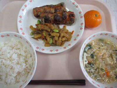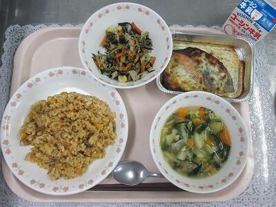 メキシカンピラフはケチャップとカレー粉で味つけをし、ちょっぴり、ぴりカラのピラフに仕上がりました。粒マスタード焼きは秋においしい「秋鮭」にソースがかかり、みんなよく食べてくれていました。