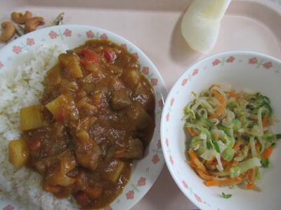 ポークカレーライス バンバンジー風サラダ 梨 カシューナッツ小魚