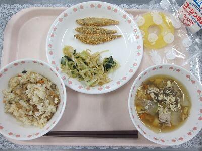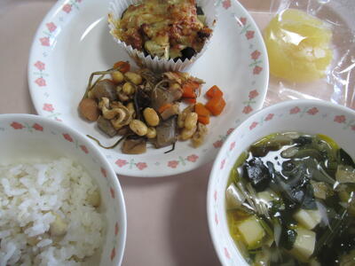 聞きなれない「じゅうしぃ」は沖縄県の炊き込みごはんです。しっかり味のついた豚肉やこんぶががたくさん入って食べやすく仕上がりました。スープにはもずくと冬瓜、まだまだ暑い日が続いているので、沖縄風料理を食べて元気にすごしてください。