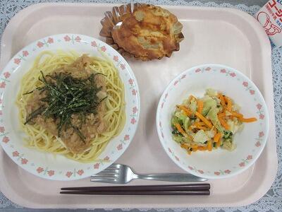 今日はみんなが好きなメニューです。スパゲティはさっぱり「大根とツナ」のソースです。今日のパンケーキには生の梨(白井市の豊水)をスライスして生地に混ぜ込んでいます。秋の味を感じてもらえたでしょうか。