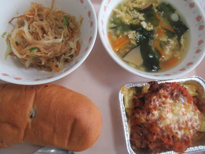 9月18日 ぶどうパン 秋なすとポテトのミートグラタン かむカムサラダ たまごとわかめのスープ
