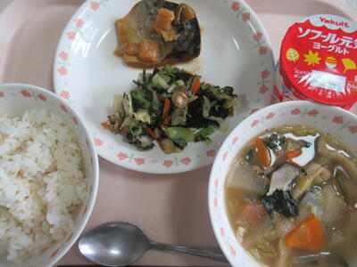 今日は純和食献立で、子どもたちにも人気がある鯖の味噌煮がメインである。味噌煮はネギやショウガをたっぷりと使って魚臭が取り除かれ、ふっくらと美味しく煮込まれている。給食の大釜でたくさんの鯖を煮るので、味のしみこみ方も身の食感も大変美味しく仕上がって、白いご飯にも大変よく合っている。そして今日のお汁はすいとん汁。すいとんというと戦時中の食糧難の時代の主食だったと聞くが、今のすいとんは野菜たっぷりとはいった上に、米粉の手作りすいとんが入っており、すいとん効果のとろみもついて大変美味しい。今では野菜たっぷりの贅沢なお汁である。添えられている野菜は磯香和え。磯香になるのは海苔の香りで、口に含むと小松菜のシャキシャキ感と一緒に海苔の香りが鼻から抜けていく磯香たっぷりの味で、これもとても美味しい。ゆっくりといただきながら、和の豊かな味を味わうことができた。