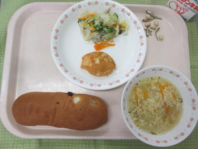 7月3日(水)タンドリーチキン キャベツとしめじのサラダ たまごのオニオンバジルスープ ブドウパン 大豆小魚