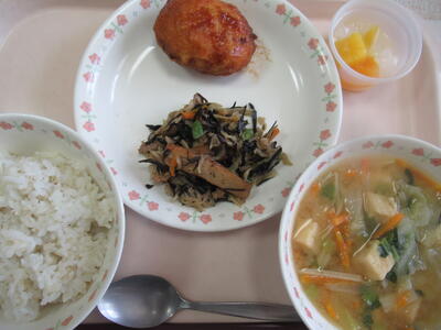 7月4日(木)ゼリーフライ ひじきと切り干し大根の炒め煮 キャベツの味噌汁 フルーツナタデココあえ