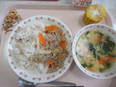 今週末は七夕の7月7日を迎え、給食も七夕仕様の献立。七夕汁はそうめんの流れ星に★型のかまぼこが浮かび、卵に小松菜、にんじんと彩りもよく、すまし汁の出汁も効いて美味しく仕上がっている。温かい汁であるが、爽やかな彩りで美味しくいただいた。メインは塩豚タマネギ丼で、ニンニクがしっかりと効いた塩麹を使ったような味付けで、ご飯と絡めてとても美味しい。タマネギもたっぷりと入って、味に厚みを出してくれている。とうもろこしは今が旬。今日のとうもろこしは、柏市大井産のとうもろこし。午前中の5年生の農家インタビューで訪れた大塚さんのとうもろこしに当たれば最高でしたが、甘みがしっかりとある美味しいとうもろこしだった。午前中は農業に関しての学習に同行した。七夕というのに35度を超える猛暑日となり、美味しい食事を支えている野菜がこれからも収穫できるのか、不安を感じながらいただく給食だった。