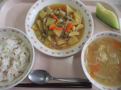 今日は季節の梅のご飯と季節を表す献立である。日曜日に和歌山県みなべ町のうめ課の課長のがNHKに出ていたが、今年のような不作となると日本の伝統的な果実である梅の栽培をする後継者問題にも響いてくる。梅の実を食べてきた日本人のDNAに響く効果があるのだろうと、暑さの中で体に響く梅の酸っぱさを味わった。和歌山の南高梅のみならず、梅の栽培がじゃがいもと青大豆の煮物は、鶏肉風肉じゃがに青大豆のタンパクも加わっての味付けで、青大豆も美味しく炊き上げられて美味しい。ジャガイモも新じゃがの季節になり、夏は野菜を美味しくいただくよい季節である。味噌汁には、鮭も入っていて献立を見ずに食べ始めたものにとっては、何か得をしたような気分になった。大根、豆腐、鮭と味噌汁を美味しくいただいた。メロンは千葉県飯岡産のもの。太平洋岸の温暖な気候で育った美味しいメロンであった。