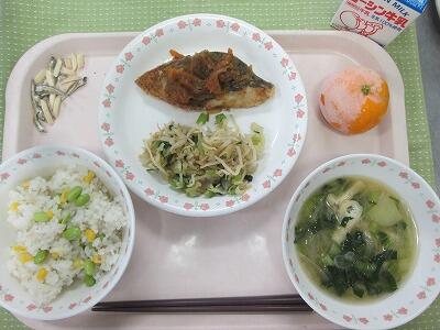 7月9日(火)牛乳・夏の彩りごはん・あじの南蛮漬け・からし和え・柏の野菜みそ汁・冷凍みかん・アーモンド小魚