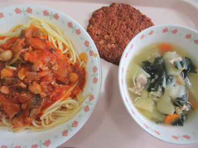 今日のスパゲティーはラタトゥイユソースかけというあまり耳にしない名前のスパゲティーで、パスタを使っているがフランス料理の仲間のようである。もりもりだよりによると、ラタトゥイユは南フランスの料理で、トマトやなすなどの夏野菜をオリーブオイルで炒めて煮込んだ料理のようで、スパゲッティーに合い、野菜の甘さや旨味を感じるソースでトマトベースのスパゲッティーであるが、イタリアンとは少し違う感じが美味しい。ポテトスープは、名前のとおりジャガイモが形でもありスープにもしっとりと溶け込んで、ジャガイモのおいしさが出ているスープである。お肉とレンズ豆も入ってタンパク質も豊かにとることができる。今日のデザートはオートミールビスケット。オートミールはオーツ麦のシリアルで、麦そのものを使って加工されているため栄養価が高い食品で、ミネラル・カルシウム・ビタミン・繊維が豊富ではちみつ仕立てのパリッとした美味しいビスケットに仕上がっている。