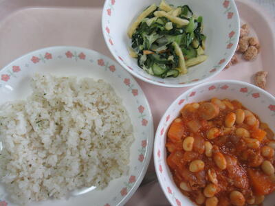 今日はどちらかというと中米風献立かな?豆のトマト煮込みは、アメリカンな味でひき肉と3種類の豆の組み合わせで味に深みのある煮込みになっている。大豆とインゲン豆とレンズ豆と3種類の豆をたっぷりと食べられるのは給食ならでは味だと思う。ガーリックライスとの組み合わせもなかなかよい。ガーリックライスのガーリックはもう少しパンチがきいていてもよいかと感じる。グリーンサラダ揚げ野菜和えは、なかなか面白い組み合わせで、グリーンサラダにポテトフライとごぼう素揚げが組み合わせているところが、おいしい。揚げたもののカリっと感があるとさらによい。ただ、塩加減がかなり薄いように感じた。