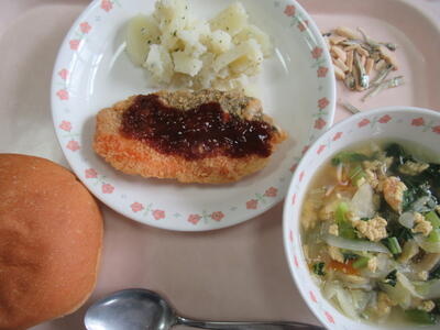 今日はパン食の献立で、メインは鮭のフライ。鮭の切り身にパン粉がふられて、からりと揚げられ、ソースがかかってパンと一緒に美味しくいただけるようになっている。パンに挟むように丸パン仕様であったが、パンには挟まずにそれぞれの味を味わいながらいただいた。パンは中がしっとりとして美味しく焼き上げられたパンである。粉ふきいもは、粉ふきになるようにほくほくに蒸し上げられていて、パセリがふられて美味しい。エビとたまごのスープは、エビとタマネギとたまごとキャベツなどの野菜がたっぷりと入り、具材とエビを一緒にいただくと、エビのおいしさがジュワーッと出てくるスープに仕上がっている。具材の味はたっぷりとしているが、若干スープの味にパンチが欲しいところであった。アーモンド小魚はオーブンでカリッとしあがって美味しくいただいた。