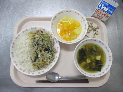 2学期の給食がスタートした。最初はカレーといった献立ではなく、ねぎ塩豚丼と豆腐のスープと夏バテからの回復メニューである。豆腐のスープはすまし汁ではなくてスープ。出汁がよくきいて透明なおいしいスープである。豆腐とわかめの味が引き立つスープに仕上がっている。メインのねぎ塩豚丼は、ごはんと具を一緒に食べると、もやしのシャキシャキ感と塩味を感じる豚肉のジューシーな味が広がり、おいしい豚丼である。豚肉のビタミンと野菜をしっかりといただけ、力になるごはんであった。デザートはフルーツポンチで、ミカン、パイン、黄桃に今日はリンゴも入ったフルーツ群であった。