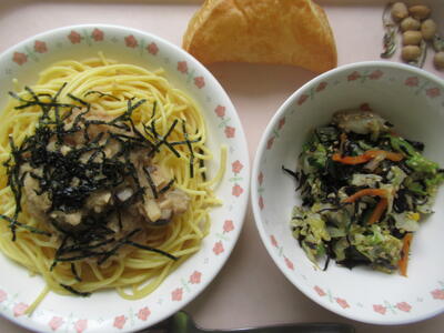 4月18日(木)大根とツナのスパゲティー ひじき入り鉄人サラダ ストロベリーパイ 大豆小魚