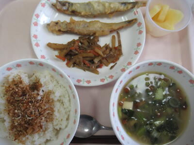 4月19日(金)手作りちりめんふりかけ ししゃものサクサク揚げ 五目きんぴら なめこ汁 パイン缶
