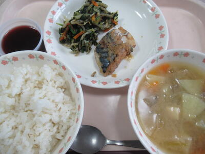 今日は和食献立でお魚メニューの鯖のおろし煮。写真ではわかりにくいが大根おろしがかかっており味噌煮のような煮かたでなく薄い甘辛煮におろしがかかっている。白いご飯に合う味になっており、鯖の身にもしっかりと味がついて美味しい。おろしがたっぷりあるとさらに旨さが増すと想う。のりあえは海苔とにんじん、ほうれん草、もやし、キャベツの和え物で、海苔の香りと野菜の食感を楽しむ味で、ご飯にも鯖にも合う。磯の香りと野菜を和えて、海のもの山のものという趣があり、磯香和えというネームはどうだろう。豚汁はお肉と根菜がたっぷり入り、ネギの香りを豊かに味わうお汁である。手作りグレープゼリーは、ブドウ果汁を寒天で固めた手作り味。寒天も目立たないが健康によい食材で、諏訪地方などで多くの種類が売られている。今時のプルプル感とは違うが、寒天の良さを感じながらいただいた。低学年の教室を見回ると、ご飯もお魚も野菜も全て食べている子が大半で安心する。食べやすく骨が無いようになっていることも、食を進める要因になっているようである。