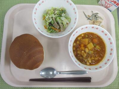 4月25日(木)ポークビーンズ キャベツとしめじのサラダ 給食ロール アーモンド小魚