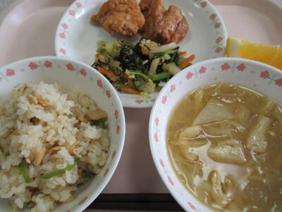 4月26日(金)筍ごはん 鶏の唐揚げ たまねぎの味噌汁 塩昆布あえ 美生柑