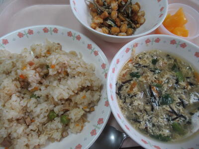 4月30日(月)五目チャーハン たまごとひじきのスープ 大豆と小魚の揚げ煮 もも缶