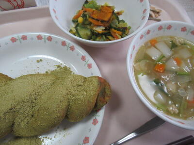 5月1日(水)抹茶揚げパン 柏野菜のスープ 焼きカボチャサラダ