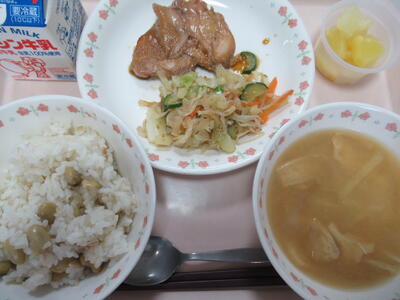 6月25日 青大豆ごはん とり肉の照り焼き かんぴょうのごま酢和え 玉ねぎの味噌汁 パイン缶