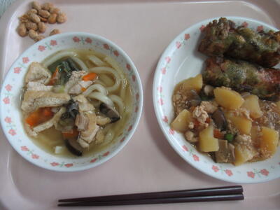 6月26日 山菜うどん 竹輪の磯辺揚げ じゃがいものそぼろ煮 きなこ大豆