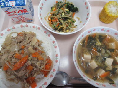 今日は韓国風献立で、塩豚丼。豚肉がたっぷりでご飯と一緒にしっかりとからめて美味しくいただけるどんぶりで、美味しい。切り干し大根のナムルも豆もやしとニンジンなどの野菜たっぷりに切り干し大根の旨味が出て、美味しいナムルに仕上がっている。キムチスープは、一口でキムチの香りと味を楽しめ、キムチ感がたっぷりのスープでとても美味しい。今日は、なんといっても午前4時に収穫された染谷さんのトウモロコシ。3年生が皮むきをしてくれ、蒸し上げたトウモロコシは、甘みたっぷり、旨味たっぷりで大変美味しいトウモロコシである。美味しい食材の向こう側には、丁寧に育ててくださった農家の皆さんの苦労と、調理室の苦労が垣間見ることができる。