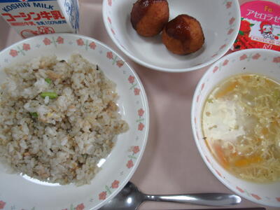 7月2日枝豆とさけのピラフ ファラフェル 卵とオニオンのバジルスープ アセロラザリー