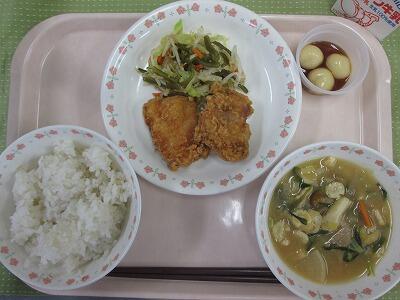牛乳・ごはん・とりのから揚げ・茎わかめのあえもの・打ち豆のみそ汁・みたらしだんご