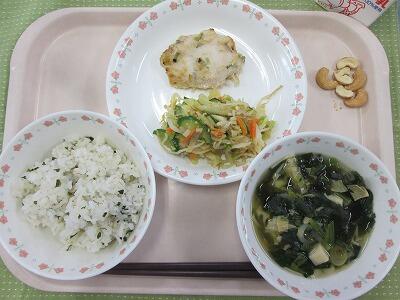 牛乳・わかめごはん・とり肉のねぎみそ焼き・かんぴょうのごま酢あえ・ゆばのすまし汁・炒りカシューナッツ