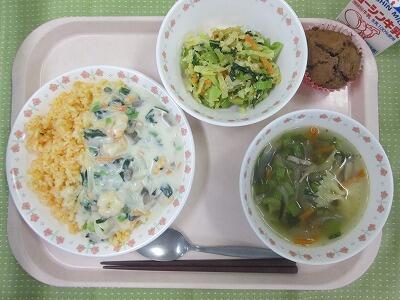牛乳・キャロットライスのエビクリームソースかけ・ごまドレッシングサラダ・マカロニスープ・チョコチップマフィン