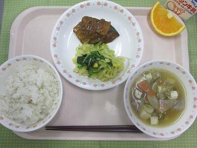 牛乳・ごはん・さばのごまみそ煮・菜の花あえ・けんちん汁・清見オレンジ