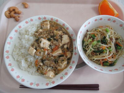 今日の献立は中華献立。麻婆豆腐丼は具沢山でご飯にしっかりと絡む味でとてもおいしく仕上がっている。豆腐もたっぷりと入り、人参、ショウガ、ネギ、シイタケとおいしい麻婆豆腐である。今日は今までとちょっと異なるのは、辛味がしっかりと感じられること。ラー油の味わいを感じるところが、旨味を引き立てている。中華サラダは、春雨や小松菜、人参、もやし、きくらげ、とこちらも野菜がたっぷりのサラダで、ごま油と酢が効いたおいしい味付けで、麻婆豆腐丼によく合っている。今日のデザートのせとかは、薄い皮でジューシーで上品な甘さのおいしい柑橘である。カシューナッツは給食に出場することが、今回が最終回となるナッツである。来年度からはアレルギーの関係で、給食では扱わない食材となってしまうのである。カリっと香ばしいおいしいナッツであった。