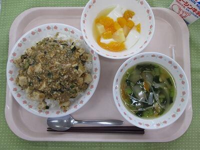 牛乳・マーボー豆腐丼・ビーフンスープ・杏仁豆腐