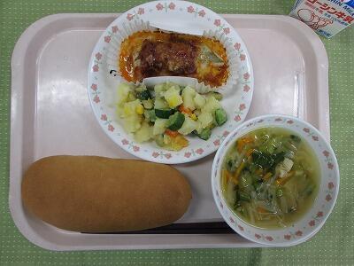 牛乳・コッペパン・たらのピザソース焼き・マセドアンサラダ・せん切り野菜のスープ