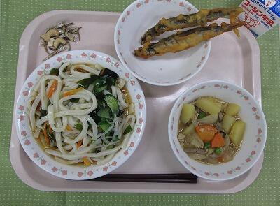 牛乳・冷やしうどん・ししゃものサクサク揚げ・じゃがいものそぼろ煮・小魚カシューナッツ