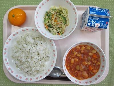 牛乳・ガーリックライス・豆のトマト煮込み・バンバンジー風サラダ・冷凍みかん