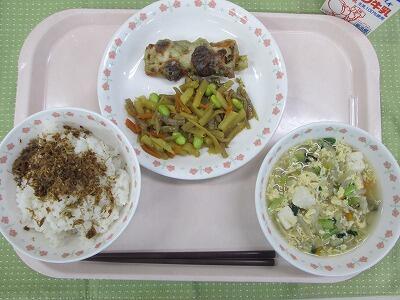 牛乳・ごはん・手作りちりめんふりかけ・竹輪の磯辺揚げ・カレーきんぴら・かんぴょうの卵とじ