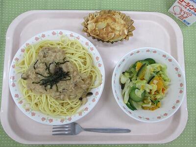 牛乳・大根とツナのスパゲティ・焼きかぼちゃサラダ・梨パンケーキ