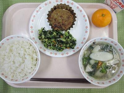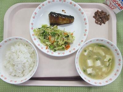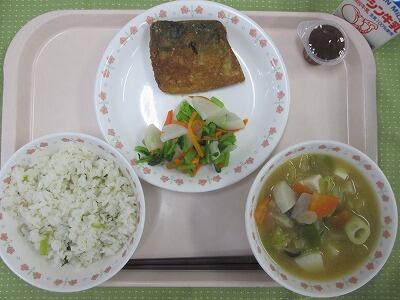 牛乳・チンゲン菜ごはん・さばのカレー揚げ・かぶの酢のもの・いものこ汁・ひとくちぶどうゼリー