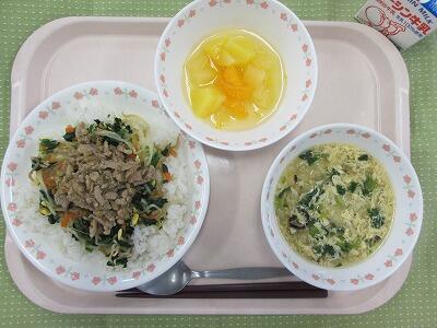 牛乳・ビビンバ・中華たまごスープ・フルーツあえ