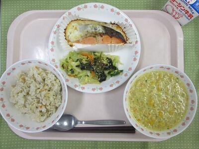 牛乳・ツナピラフ・鮭のマヨネーズ焼き・海そうサラダ・とうもろこしのスープ