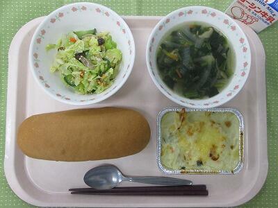 牛乳・ブランコッペパン・柏野菜のグラタン・キャベツとしめじのサラダ・ほうれん草のスープ